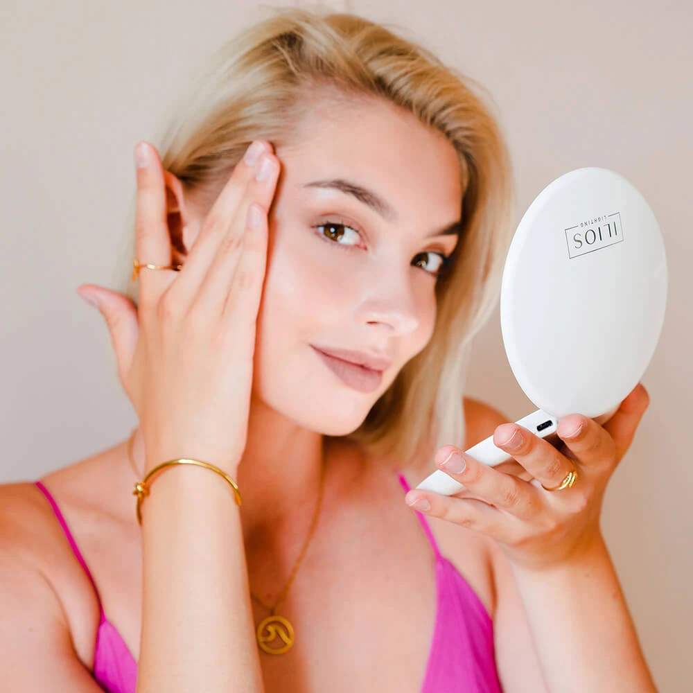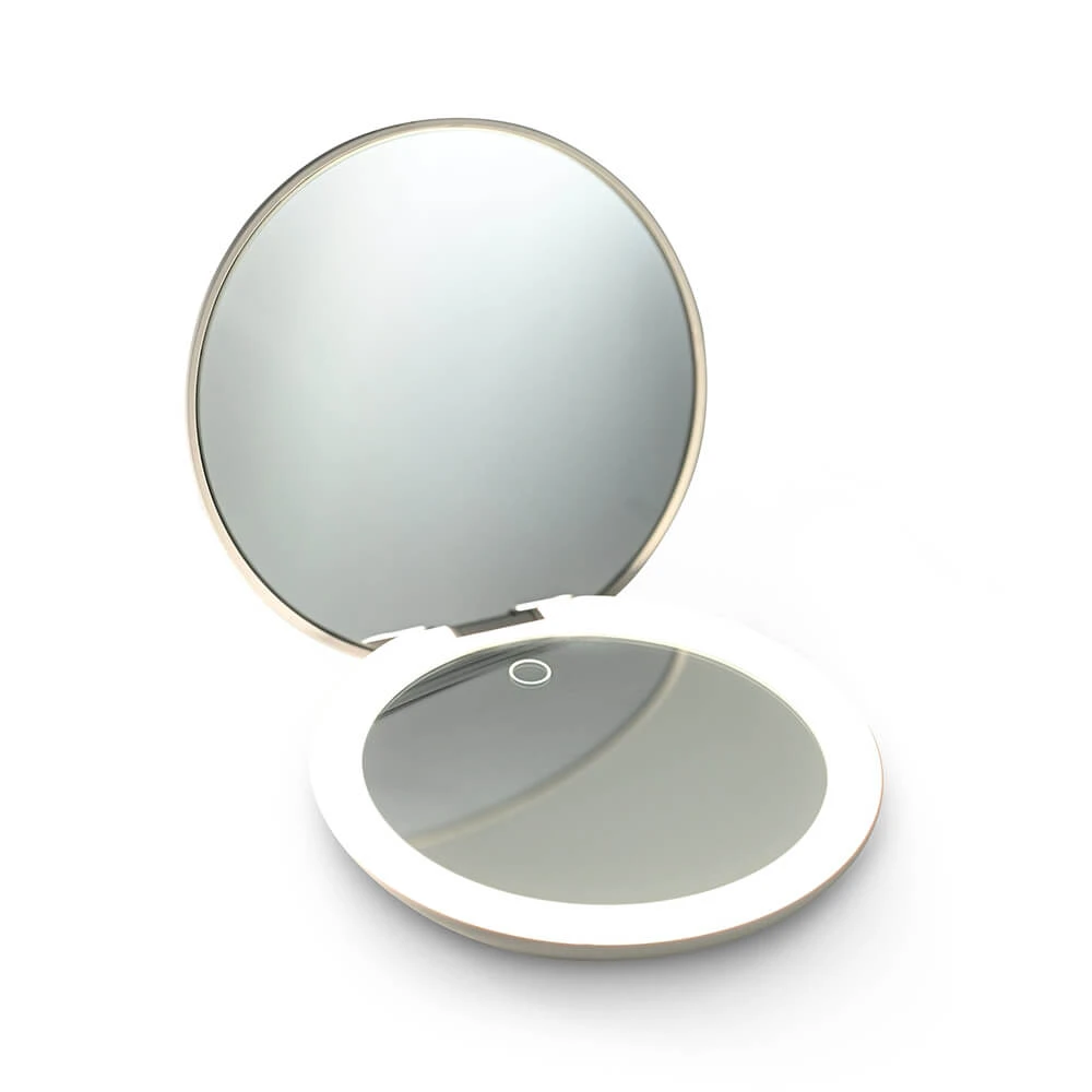 A perfect travel mirror featuring a 1x and 10x magnification. The slim and sleek design is ideal for placing in your pocket, handbag, or purse. Unlike most small magnifying mirrors, the 5-inch size is large enough to see your full face. The simple and intuitive design allows the light to be dimmed seamlessly. The rechargeable battery lasts up to 30 days, so leave it in your bag for daily touch-ups on the go.