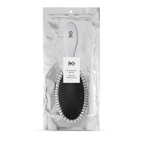 The R+Co Detangling Brush is a sleek, custom grey design ideal for smoothing or detangling hair while remaining gentle on the scalp.