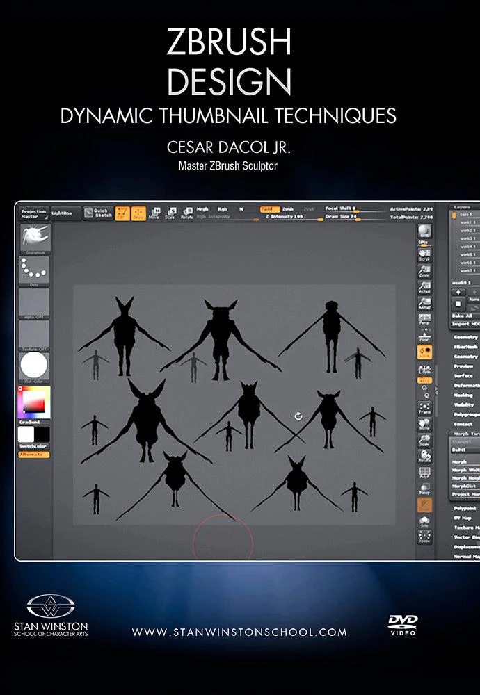 Speed sculpting character designs in ZBrush using layering techniques to create multiple design variations.
